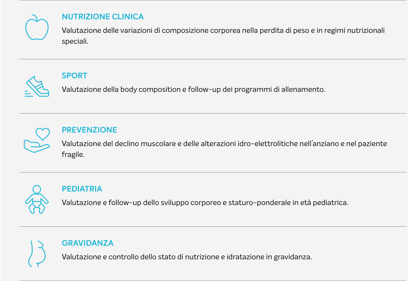 Questo aiuta a stimare la % di grasso corporeo, di massa muscolare e la quantità di liquidi nel corpo.