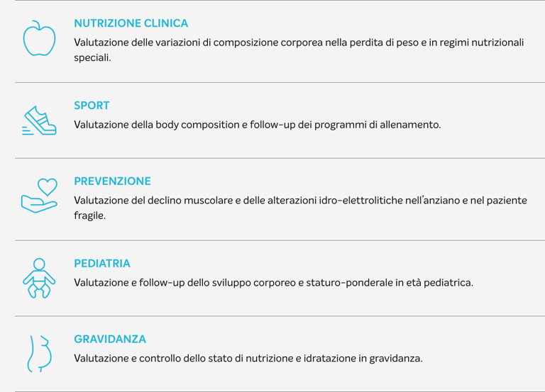 Rappresenta il metodo più attendibile per capire di cosa è fatto realmente il tuo peso valutando lo stato nutrizionale, muscolare ed idro-elettrolitico del tuo corpo.
